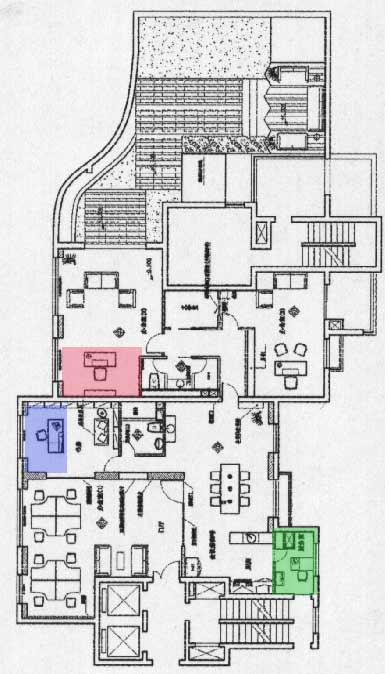 1、财务室小而精,本是一喜,但此处并非最佳位置,放走了一部分财。2、洗手池、卫浴设计精巧,但是在整体建筑之中央安排,会比较泄气,应该移掉。3、作为经公司理的坐镇的位置(蓝色区域),并非经理的正位,所以该部下稍嫌不得力,容易被动。
