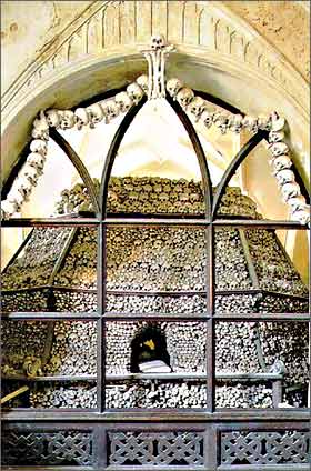 捷克的“人骨饰教堂”建于14世纪,这里的天花板、墙壁上尽是人骨串成的装饰品,据统计,这些饰品大约用掉一万具尸体。在1369年,一次瘟疫使3万人丧生,尸骨遍地,因此教堂当局决定用未葬的尸骨装饰教堂。这项令人毛骨悚然的任务一开始是交由一位半盲的僧侣来执行,1870年间,一位受雇于Schwarzenberg家族的木刻师傅,开始将人骨排列成各种图案,其中包括Schwarzenberg的家徽与Rint自己的签名。